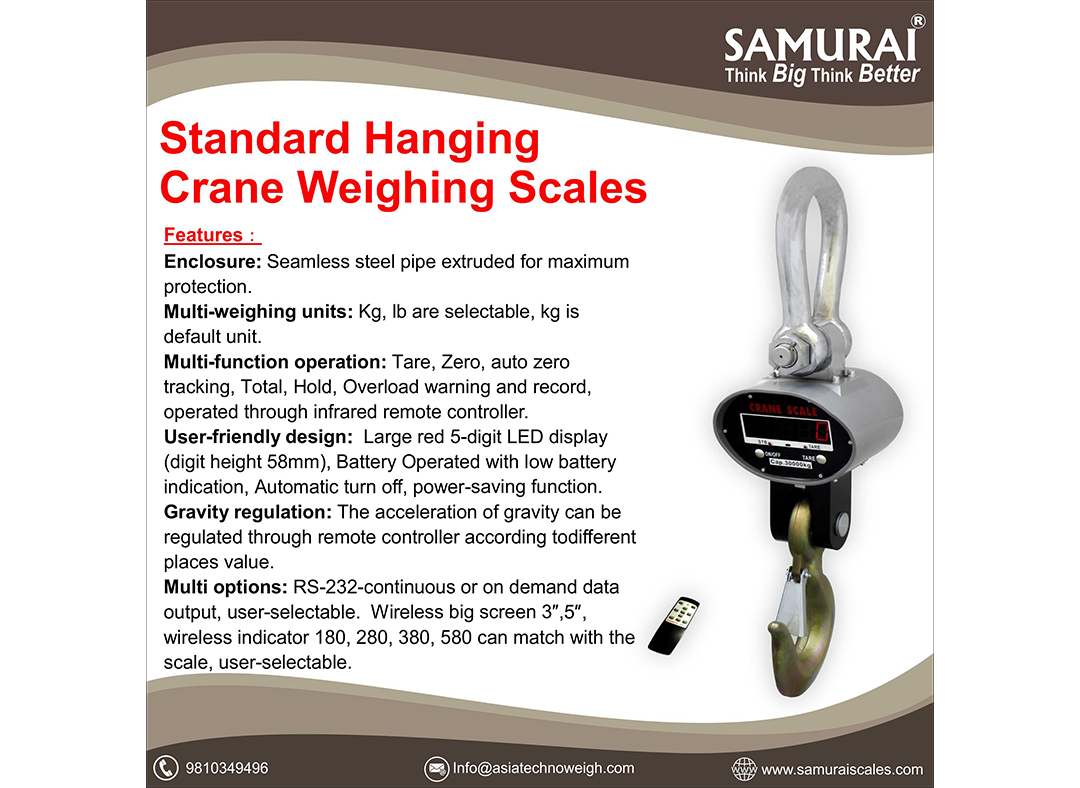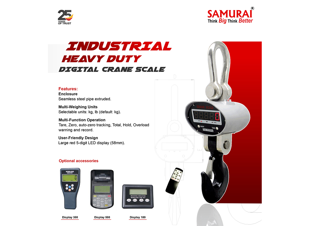Samurai Industrial Crane Weighing Scale is designed for industrial weighing, overhead load measurement, and safe material handling. With a seamless steel body, high-visibility LED display, and remote-controlled operation, this crane scale delivers dependable performance in demanding environments. Manufactured as per OIML Class III, it ensures stability, safety, and long operational life.